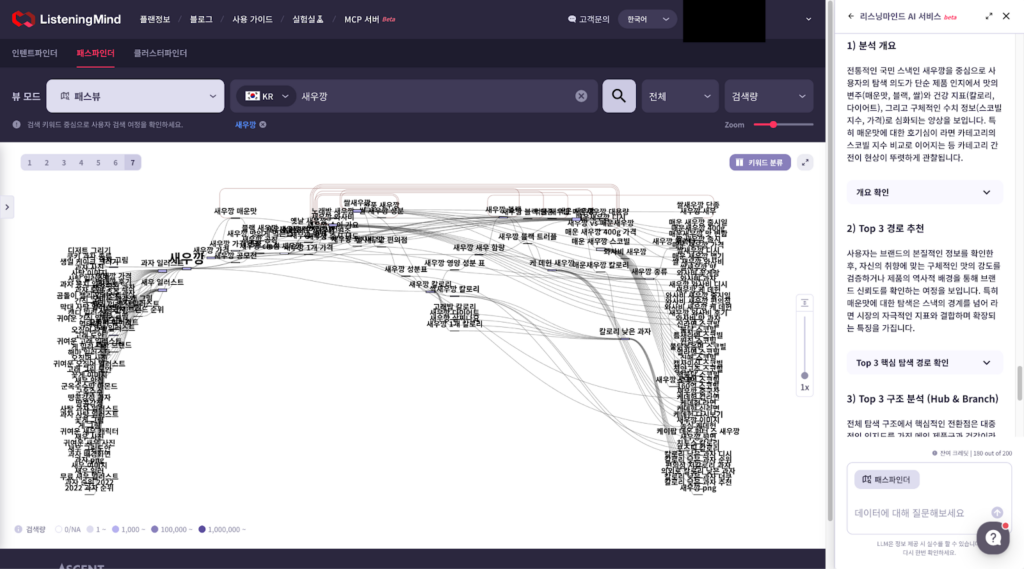 - 일반적으로 Path Finder는 100개에서 500개에 이르는 키워드의 연결선입니다. 위에서도 이야기했지만, 사실은 이 결과도 이미 많은 알고리즘으로 정제한 내용입니다. 그런데도 이 내용을 파악하고 정리하는 업무를 사람이 한다면 많은 시간과 노력이 필요합니다. 수많은 경로에서 의미 있는 경로를 찾고 그에 대해서 해석해 주는 역할은 AI가 도와줄 수 있는 중요한 부분이라고 생각합니다. 최소 3개에서 5개의 키워드 연결은 검색 사용자가 찾고자 하는 정보의 목적과 그 목적에 도달하는 과정을 알 수 있도록 해 줍니다. 물론 AI가 추천해 주는 경로가 내가 원하는 경로가 아닐 수는 있지만 추천해 주는 내용을 시작점으로 대화를 통해서 자신이 원하는 분석으로 이동해 가는 데는 부족하지 않다고 생각합니다.
