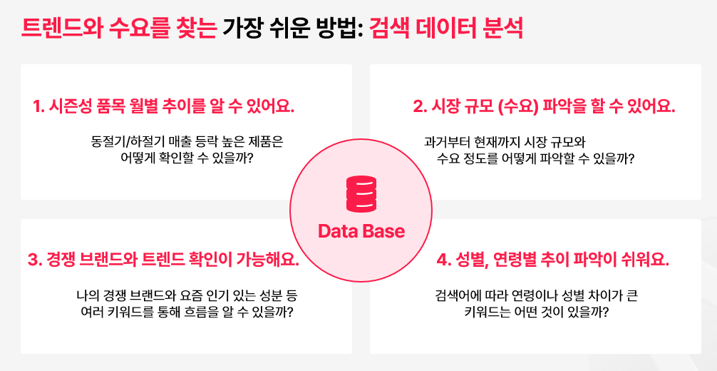 선크림 사례에서 봤듯이, 검색 데이터는 한 가지 목적에만 쓰이지 않습니다. 상품 기획부터 마케팅 전략, 연간 사업 계획까지 다양한 영역에서 활용할 수 있습니다.
