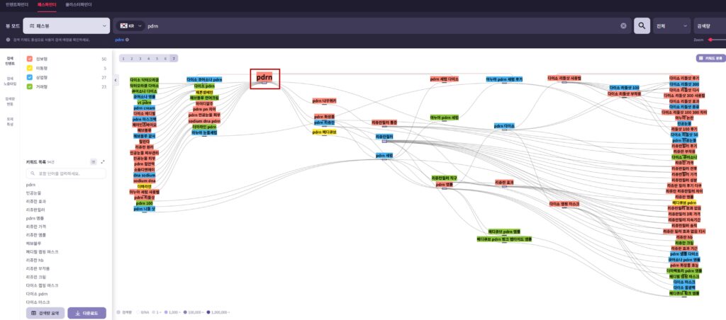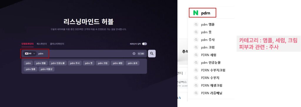 마지막으로 ‘성분’에 대한 키워드를 분석하기 위해 하나의 예시로 ‘PDRN’을 선정하여, 우측 네이버 자동 검색어를 함께 확인해보았습니다. ‘PDRN’ 성분과 관련해 소비자들의 검색 연관도가 높은 카테고리는 ‘앰플’, ‘세럼’, ‘크림’, ‘주사’ 등이 언급되는 것을 1차로 파악할 수 있습니다.