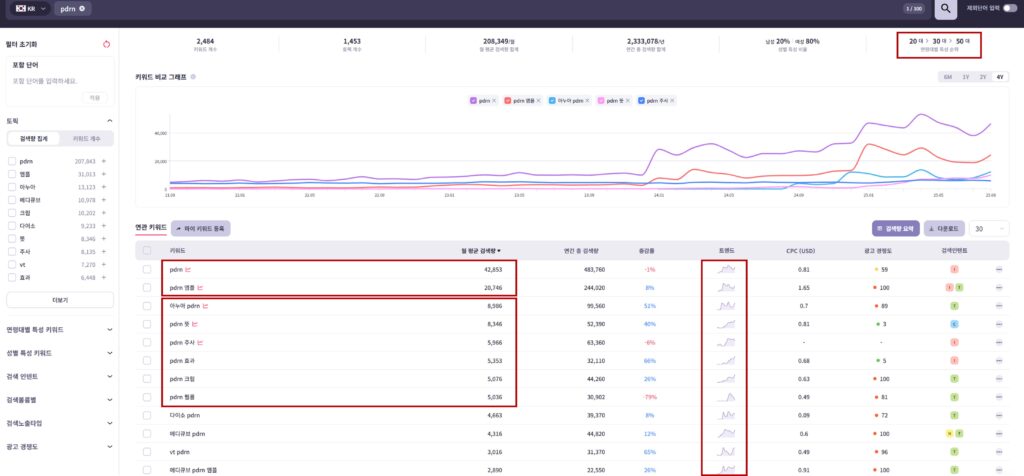 ‘PDRN’ 성분은 월 4만회 규모로 검색되고 있으며, 다음으로 가장 많이 검색되는 키워드는 ‘앰플’로 드러났습니다. 덧붙여 가장 많이 언급되는 브랜드 키워드는 ‘아누아 pdrn’으로, 해당 성분과 인지되어 검색되는 브랜드도 함께 파악할 수 있었는데요. 이 외 전반적으로 4년간 검색량 흐름을 보면, 작년(24년도) 1분기부터 성장세가 시작된 흐름이 포착됩니다. 해당 데이터와 함께, 24년/ 25년도 1분기 성장과 맞물려 어떤 활동이 있었는지 분석하기 위해 ‘네이버 데이터랩’ 기능도 활용하여 아래와 같은 내용을 발견할 수 있었습니다.