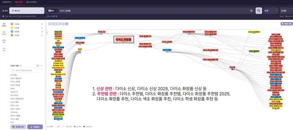 ‘다이소 화장품’ 검색 경로에서 파악할 수 있는 내용은, 다소 넓은 범주이긴 하지만 크게 두 가지 특성을 발견할 수 있습니다. 첫 번째는 ‘신상’과 관련된 키워드(다이소 신상, 다이소 신상 2025, 다이소 화장품 신상 등)로, 얼핏 보면 비슷해 보이는 키워드지만 각각 구체적인 목적을 담고 있는 것으로 해석할 수 있습니다. 이 외 ‘추천템’과 관련한 키워드로 ‘2025’ 가 붙는 키워드, 카테고리가 무엇인지 살펴볼 필요가 있는데요. (ex. 다이소 화장품 추천템 2025) 이는 데이터 분석을 기반으로 블로그 콘텐츠나 SEO 전략 시 활용할 수 있는 디테일한 요소 중 하나로 활용할 수 있습니다.