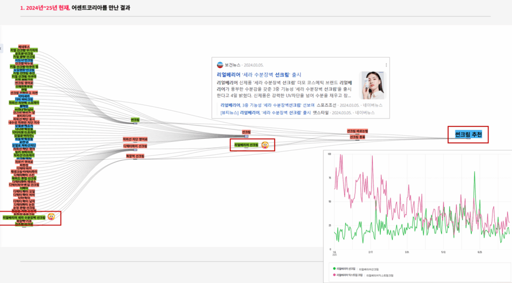 단순히 ‘선크림’이 아니라, 소비자가 실제로 검색하는 언어를 그대로 제품명과 컨셉에 반영했습니다. ‘수분’과 ‘장벽’이라는 두 개의 검색 키워드를 하나로 묶은 전략을 도출했습니다. 회의적이던 영업팀도 구체적인 검색 데이터에 “이 정도 검색량이면 시장이 있다”는 설득이 되었죠.