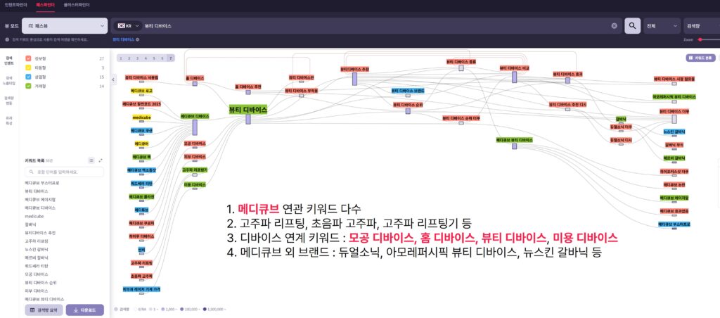 - 주로 언급되는 브랜드로 ‘메디큐브’ 연관 키워드가 다수 검색
