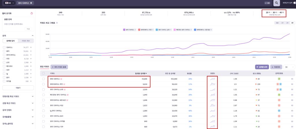 다음으로 국내의 ‘뷰티 디바이스’ 관련 키워드를 분석해보았습니다. 전반적으로 20대, 30대, 40대 순으로 검색을 많이 하고 있는 정황이 확인되며 최근 3개월 기준으로 대체적으로 우상향하는 트렌드를 파악할 수 있습니다.