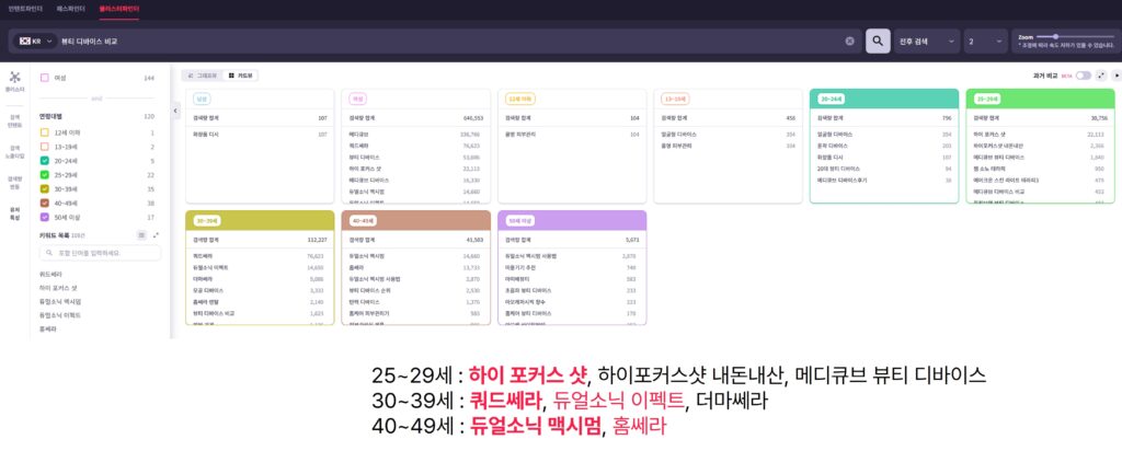 이어 ‘뷰티 디바이스 비교’ 전/후 2단계에 걸쳐 검색된 키워드들을 수집해보면 연령대별로 선호하는 브랜드가 다르게 나타납니다. 25-29세의 경우 ‘하이 포커스 샷’, ‘메디큐브’ 의 검색량이 대부분을 차지하고 있으며 30대는 ‘쿼드쎄라’ 라는 브랜드의 강세가 보입니다. 이 외 40대는 듀얼소닉 브랜드를 많이 검색하고 있습니다.