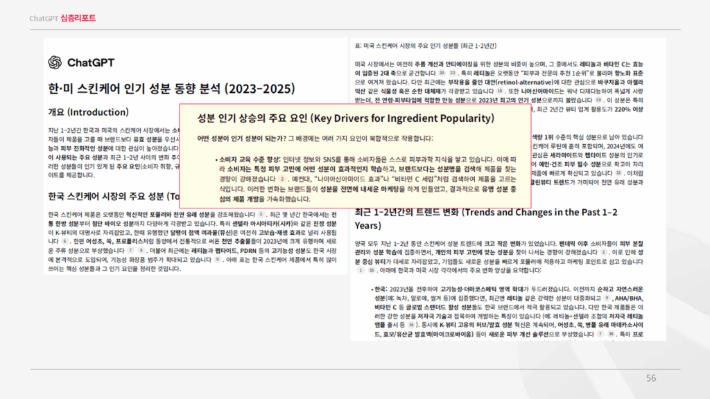 예를 들어 위와 같이 한국과 미국의 스킨케어 성분 트렌드를 GPT에 요청하면 수십 페이지 분량의 분석 결과가 도출됩니다. 핵심은 소비자가 더 이상 브랜드가 아닌 성분명 중심으로 제품을 탐색한다는 점이다. 이런 패턴을 발견하면, 기획자는 “우리 브랜드는 어떤 성분을 리드할 것인가?”, “퍼널의 초반 접점에서 어떻게 노출을 설계할 것인가?”라는 전략적 질문으로 연결해야 합니다.