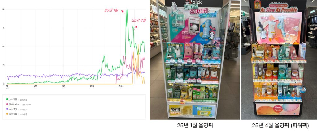 앞서 발견한 pdrn 연관 키워드 중, 검색량이 높았던 ‘pdrn 앰플’, ‘아누아 pdrn’, ‘pdrn 주사’, ‘pdrn 필름’ 키워드를 기반으로 네이버 데이터랩의 검색 트렌드를 분석한 내용입니다. (좌측) 전반적으로 25년 1월과 4월에 검색량이 급증한 추이가 발견되는데, 해당 시점에 실제로 주요 유통사인 올리브영에서 오프라인 주요 매대(올영픽/올영픽 파워팩)에 진열되었던 것으로 확인됩니다. 이처럼 올리브영과 같은 온/오프라인 트래픽이 높은 유통사는 필수적으로 함께 참고해야 하는 채널이라고 할 수 있습니다. 당연한 이야기지만 사람이 몰리는 곳에 거래가 발생할 수 밖에 없는 흐름이기 때문이죠. 이처럼 검색 데이터가 실질적으로 타당한 인과관계가 있는지, 다양한 루트로 검증해볼 수 있습니다.