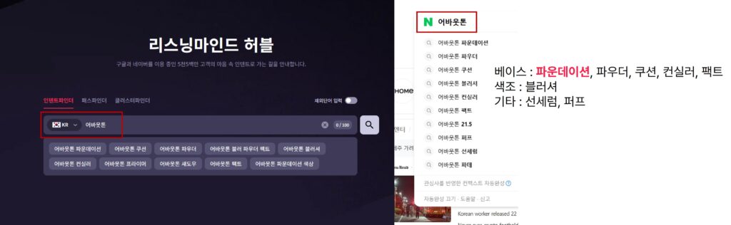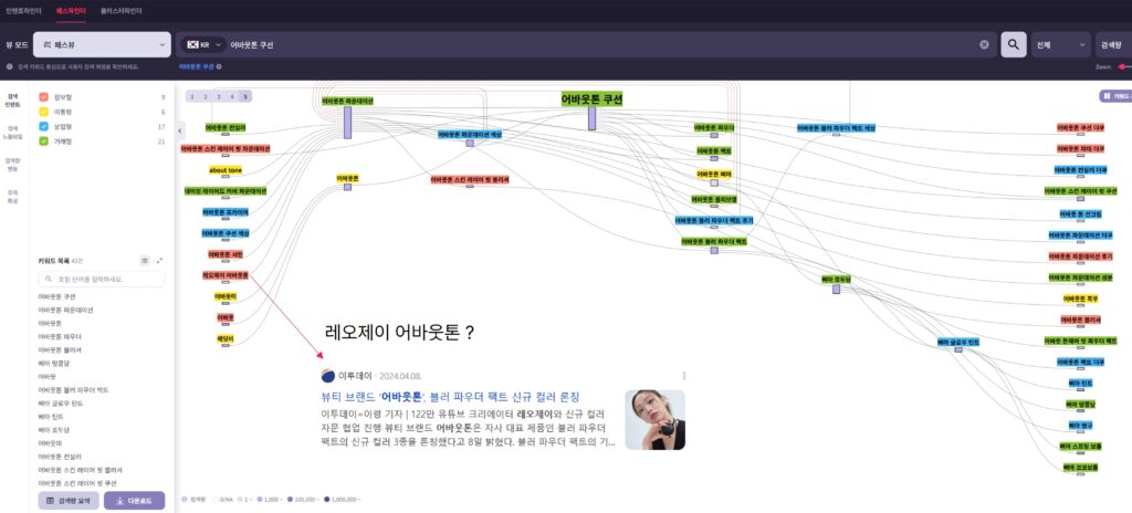 위에서 확인한 ‘어바웃톤’ 월 평균 검색량 상위 키워드 중 ‘어바웃톤 쿠션’ 키워드의 검색 경로를 살펴본 내용입니다. 보통 사람들은 검색 한 번으로 검색 여정을 마치지 않죠. 그렇기 때문에 해당 브랜드와 엮어 고민하는 ‘경쟁 브랜드’가 무엇인지, 연결된 소비자들의 니즈를 발견할 수 있습니다. 각 경로에 연결된 키워드들의 목적에 따라 키워드를 분석할 수 있는데, 그 중 한 예시로 앞 단계에 존재하는 ‘레오제이 어바웃톤’ 키워드를 분석하기 위해 어떻게 접근할 수 있을까? 해당 키워드의 검색 결과에 연결된 콘텐츠 분석을 통해 관련 마케팅의 시작 시점과 컨셉, 성과 및 영향 등을 확인해볼 수 있습니다. 이 외 ‘삐아’ 등의 경쟁 브랜드 키워드가 확인되는데, 이처럼 우리가 알고 있거나 놓치고 있던 대내외적 경쟁사들의 현황을 검색 경로 내에서 발견할 수 있습니다.