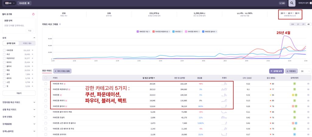그렇다면 ‘어바웃톤’과 관련된 연관 검색어와 데이터는 어떻게 나타날까? 우선 해당 브랜드와 관련해서 20대, 10대, 30대 순으로 관여도가 높은 부분을 발견할 수 있었습니다. 덧붙여 작년(24년도) 2분기부터 ‘파운데이션’ 검색량이 올라오고, 올해(25년도) 4월에는 ‘쿠션’ 제품의 검색량이 크게 상승한 추이가 발견됩니다. 수집된 연관 키워드 중 월 평균 검색량 기준 상위 키워드를 살펴보니 ‘어바웃톤’ 브랜드에서 강세를 띄는 카테고리를 한번에 파악할 수 있었습니다.