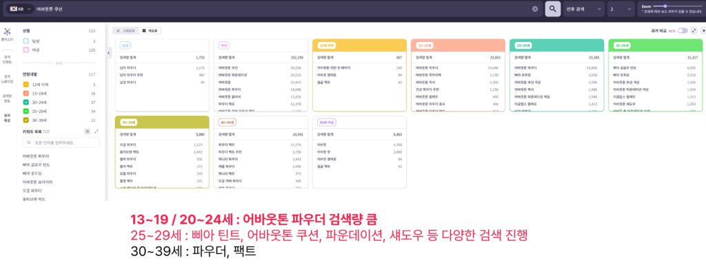 마지막으로, ‘어바웃톤 쿠션’ 키워드 전/후 검색어 2단계에 걸친 키워드를 모두 수집한 후 이를 연령별 필터를 통해 분류해보면 소비자들을 더욱 구체적으로 파악할 수 있습니다.
