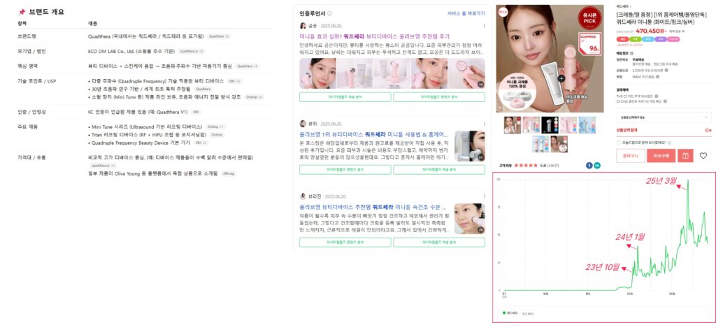 23년 12월 홈쇼핑에서 첫 론칭을 시작한 ‘쿼드쎄라’ 브랜드 디바이스는, 실제로 출시 전/후로 검색량이 급 발생하며 출시 후 25년 3월에도 검색량이 급증했던 추이가 발견되는데요. 더 나아가 론칭 후 인지도를 유지 혹은 붐업하기 위해 해당 브랜드에서 진행한 활동(입점 채널/진행한 마케팅/캠페인 등)을 역으로 분석해보며 해당 브랜드를 파악할 수 있습니다. 이처럼 검색 데이터를 기반으로 하나의 카테고리에서 급부상하는 브랜드가 무엇인지, 어떤 컨셉 혹은 어떤 전략으로 소비자들의 인지와 검색량을 끌어냈는지 등에 대한 분석이 가능합니다.