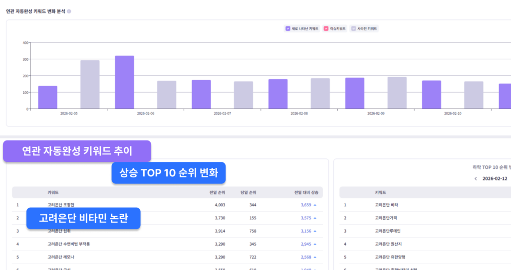 예를 들어 고려은단의 경우 가장 많이 상승한 키워드 TOP 10 중 2위가 ‘고려은단 비타민 논란’입니다. 이는 브랜드에 대한 인식 변화가 시작되고 있다는 명확한 시그널로 해석할 수 있습니다. 이처럼 자동완성 키워드 변화는 위기가 본격적으로 확산되기 전 나타나는 선행 지표에 가깝습니다. 따라서 검색 데이터에서 이상 움직임이 감지되는 즉시, 공식 입장 정리, FAQ 보완, 검색광고 메시지 조정 등 선제적 대응 전략을 마련해야 합니다.