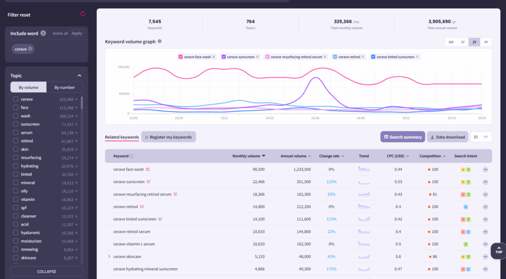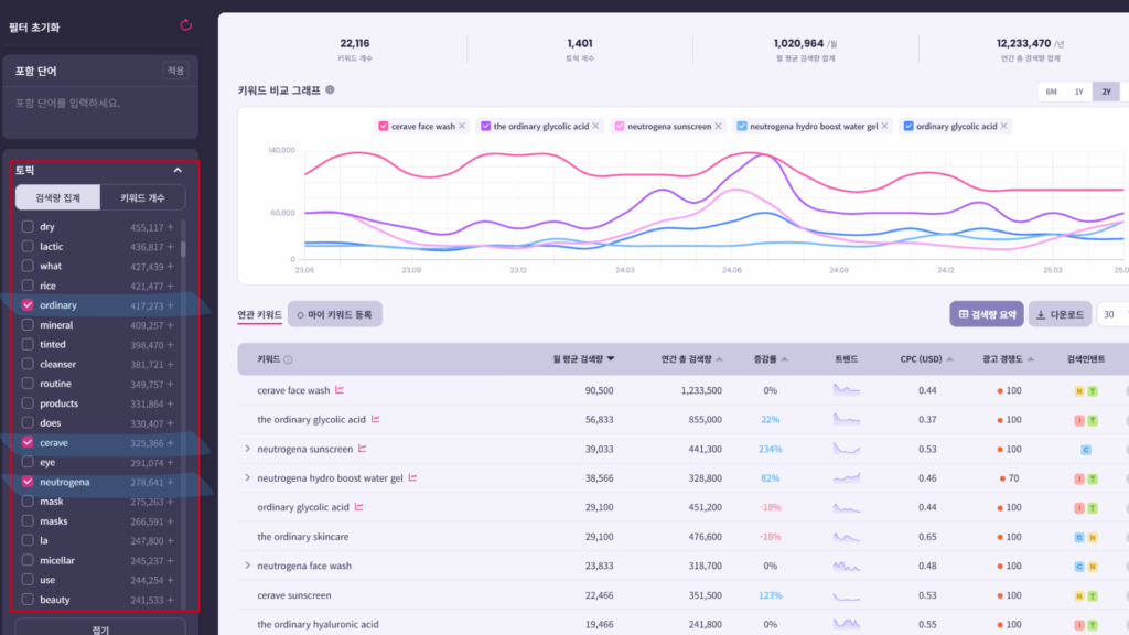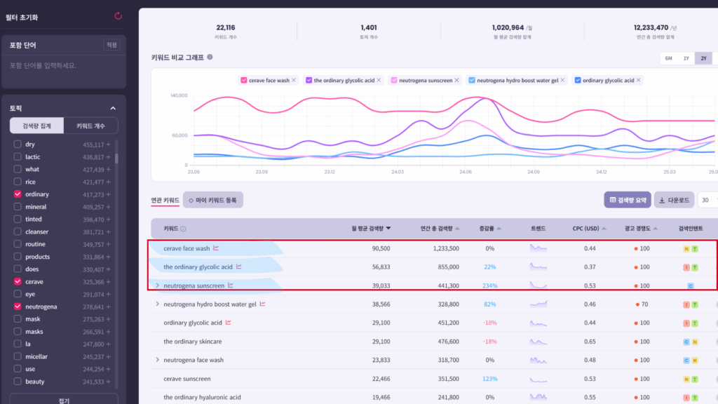 토픽별로는 두 번째로 많이 언급된 브랜드였지만, 개별 키워드 기준으로 보면 cerave face wash (세라비 페이스 워시 | 월 평균 90,500회)가 1위를 차지했습니다. 그 뒤를 이어 the ordinary glycolic acid (디 오디너리 글리콜릭애씨드 | 월 평균 56,833회)가 2위, neutrogena sunscreen (뉴트로지나 선크림 | 월 평균 39,033회)가 3위를 기록했습니다.