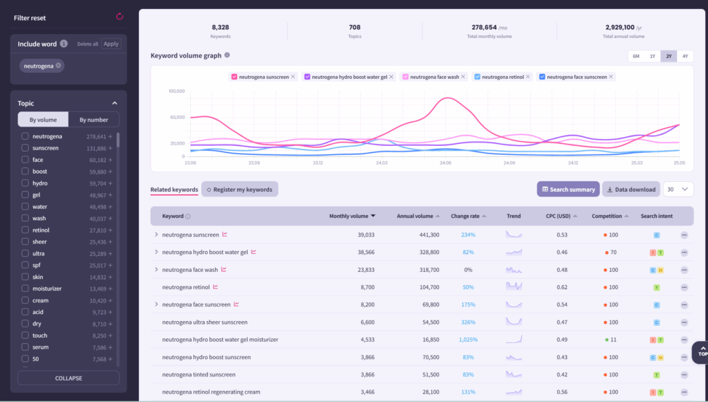 인텐트 파인더 분석에 따르면, Neutrogena(뉴트로지나 | 월 평균 278,641회)에 대한 검색 행동은 점점 더 보습과 자외선 차단 중심으로 고정되고 있으며, 대표 제품군인 Hydro Boost와 Ultra Sheer 라인에 대한 관심이 뚜렷하게 증가하고 있습니다. 전체 검색량 측면에서는 “neutrogena sunscreen”이 가장 높은 순위를 차지하고 있지만, “hydro boost water gel”, “tinted sunscreen”과 같은 키워드의 가파른 상승은 성분 효과뿐만 아니라 사용감과 제형까지 고려하는 감각 중심의 소비자들이 증가하고 있음을 보여줍니다. 특히 젤 타입 보습제와 다양한 기능이 결합된 선크림(예: 틴티드, 미네랄 기반 등)에 대한 검색 급증은 단순한 기초 케어에서 벗어나, 일상 속에서 가볍고 세련되게 사용할 수 있는 라이프스타일형 스킨케어로의 전환을 의미합니다.