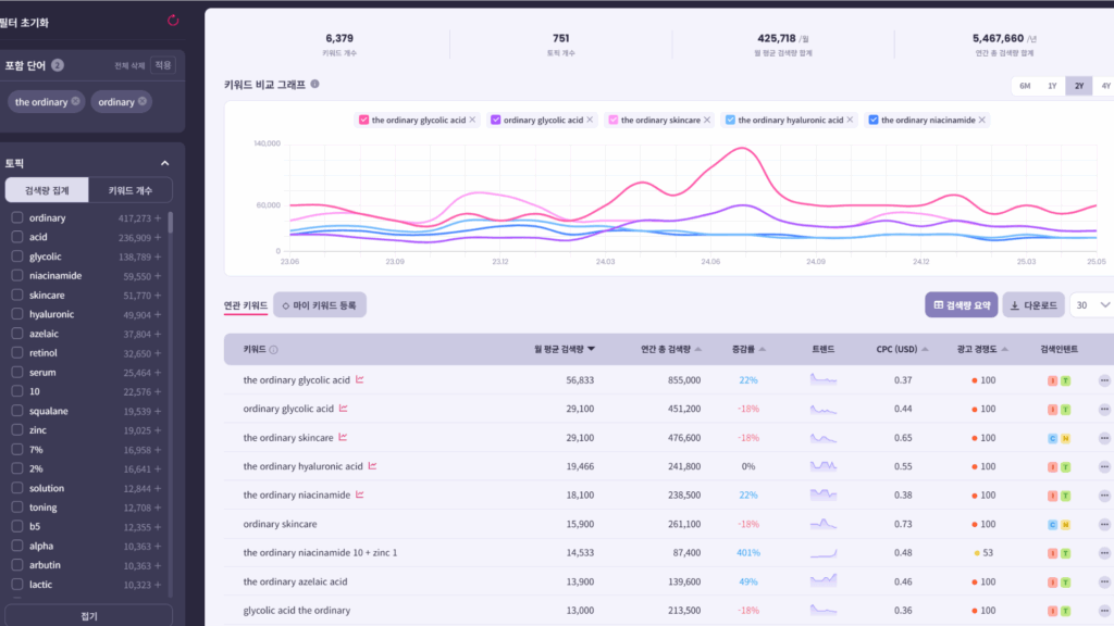 “the ordinary glycolic acid review reddit”, “routine reddit”과 같은 키워드는 소비자들이 실사용 후기를 통해 신뢰를 형성한다는 점을 시사합니다. - 사용 목적이 빠르게 다변화됨