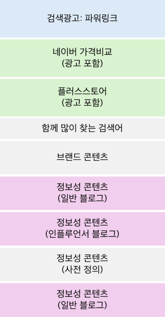 보시면 아시겠지만 광고가 차지하는 비중은 제한적입니다. 소비자 입장에서 한 번 생각해보죠. 특정 제품군에 대해 떠오르는 브랜드가 없는 사람들은 광고 뿐 아니라 검색결과페이지에 뜨는 다양한 콘텐츠를 함께 보게 됩니다.