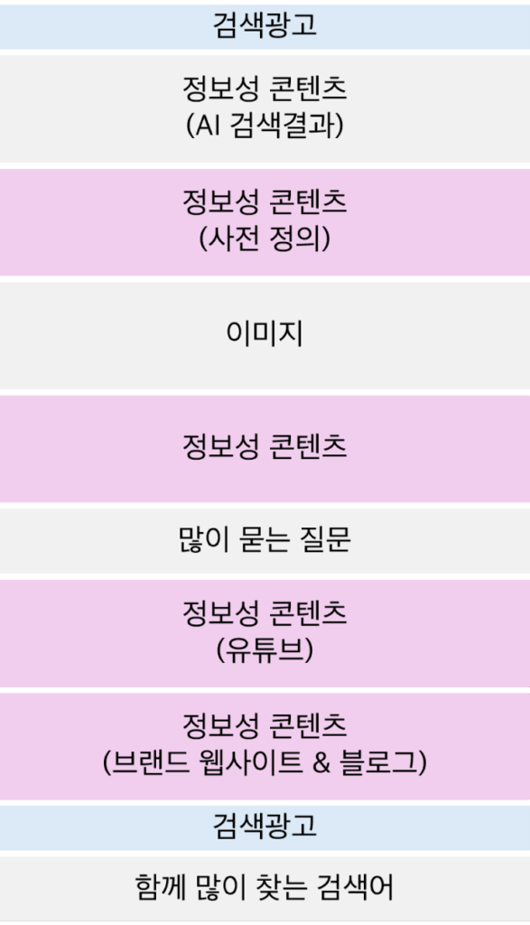그리고, 정보성 키워드 일수록 광고가 아닌 콘텐츠에 사람들이 집중하죠. 노출되는 콘텐츠 수는 제한적이기 때문에 각 지면에 자사 콘텐츠가 하나씩 배치되어 있다면 사람들은 자연스레 자사 브랜드를 인지하고 콘텐츠를 볼 수 밖에 없습니다.