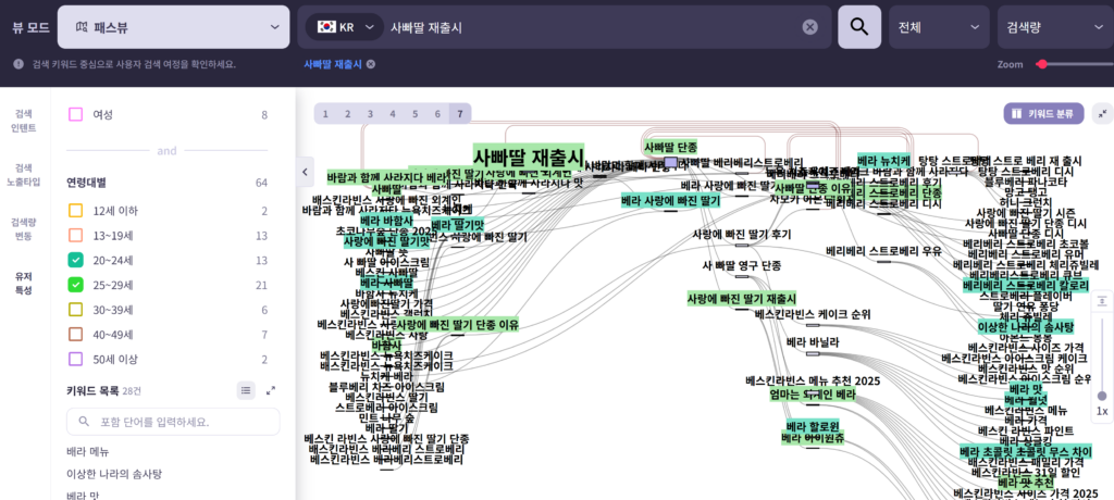 단종 직후의 검색 키워드도 주목할만 하다. ‘사빠딸 재출시’, ‘사빠딸 단종 이유’와 같이 재출시 기대감이 반영된 검색이 꾸준히 이어졌다. 검색에 참여한 연령층은 20대가 가장 많았는데, 사빠딸을 검색하면서 동시에 대체 메뉴를 함께 탐색하는 경향을 보였다. 이는 경력메뉴가 단순히 특정한 맛을 다시 경험하는 추억 소비에 그치지 않고, 브랜드 전체에 대한 관심도를 높이는 동시에 대체 소비로 확장시키는 효과를 만들어냈음을 의미한다.
