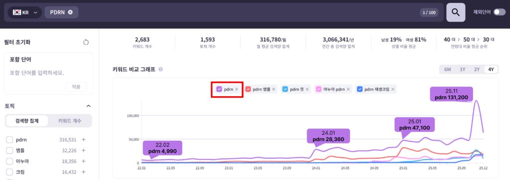 즉, 단일 키워드의 검색량 급증(Growth) 현상도 중요하지만, 이상 변화(Shift)를 감지하는 것이 초기 트렌드 포착의 핵심이라 할 수 있다. 예를들어 ‘Pdrn’ 관련 검색 데이터를 살펴보면, 22년 2월 월 평균 검색량 5천 미만에 불과했던 키워드가 24년 1월 2.8만, 25년 1월 4.7만, 25년 11월 13만까지 증가하는 흐름을 확인할 수 있다.