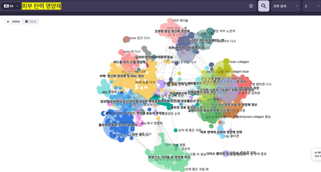 트렌드는 종종 특정 상황이나 대상과 결합되며 확산된다. ‘피부 탄력 영양제’를 기준으로 전·후 검색 키워드를 CEP 관점에서 살펴보면 다음과 같은 맥락이 드러난다.