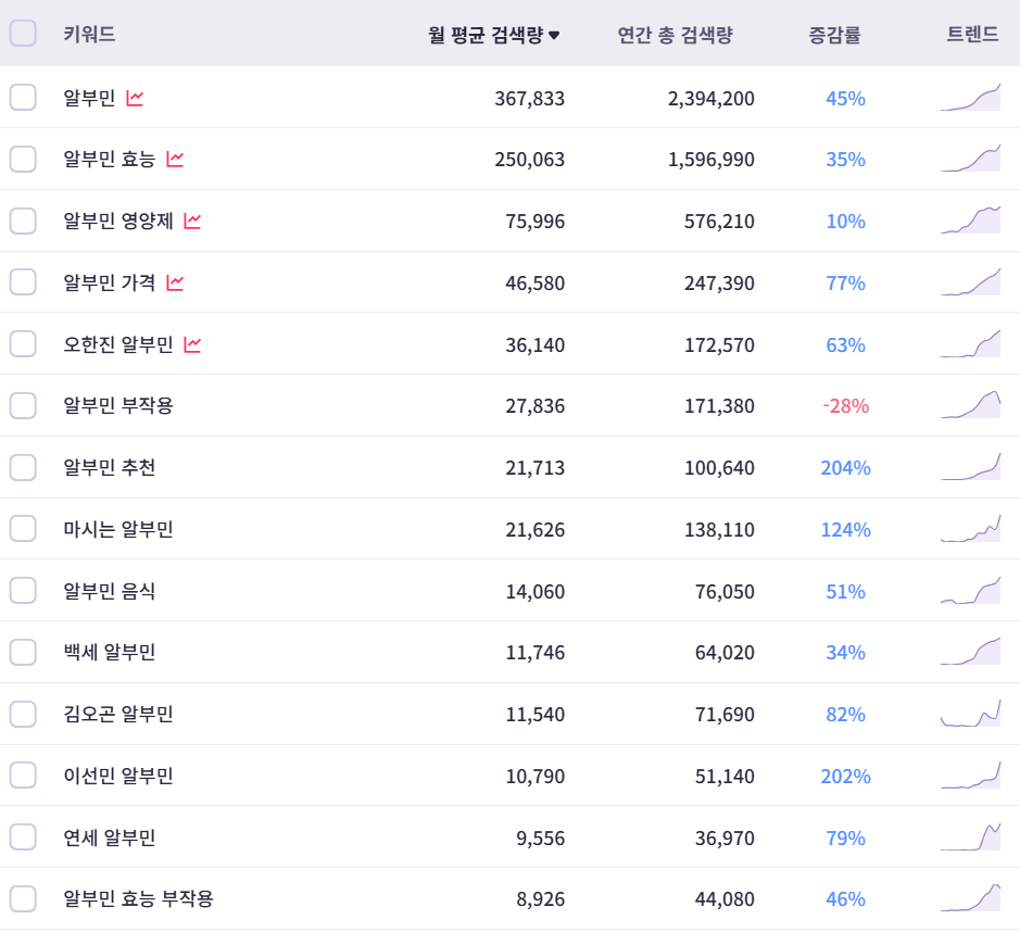 트렌드 초기에는 하나의 키워드를 중심으로, 동일한 주제를 둘러싼 질문이 빠르게 분화되기 시작한다. 예를 들어 ‘알부민’ 성분의 경우, 기존에는 ‘알부민 효능’, ‘알부민 영양제’와 같은 비교적 단순한 질문이 주를 이루었다면, 이후에는 보다 세분화된 질문 키워드가 등장한다.