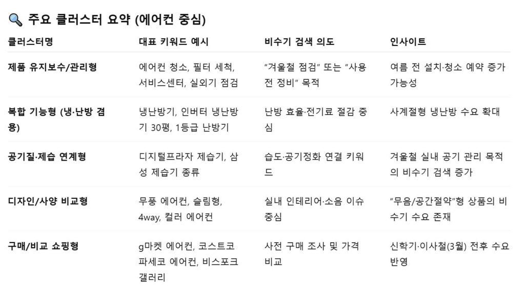 - 에어컨: 비수기에도 ‘청소·관리·전기효율·냉난방’ 키워드로 꾸준히 검색
