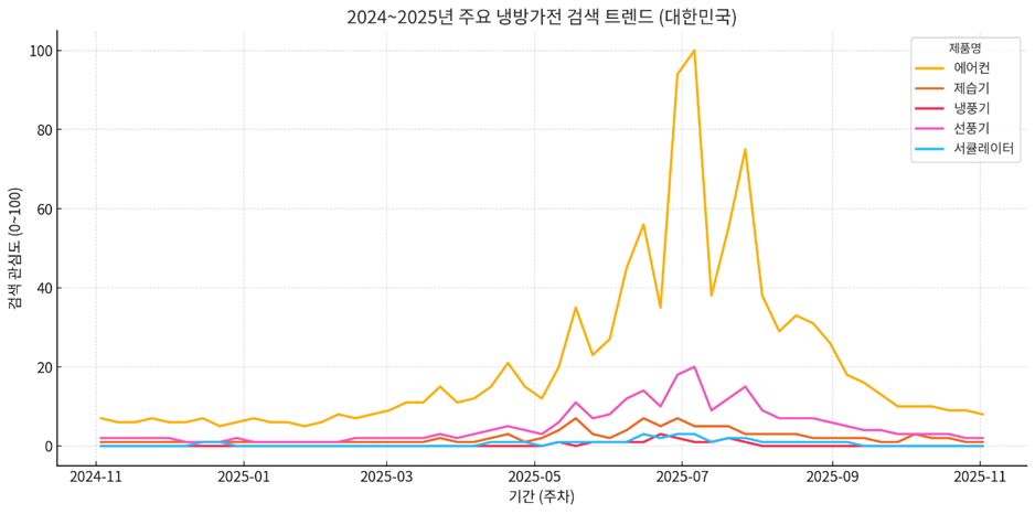 - 검색 트렌드 – 최근 12개월간 냉방가전 검색량 변화