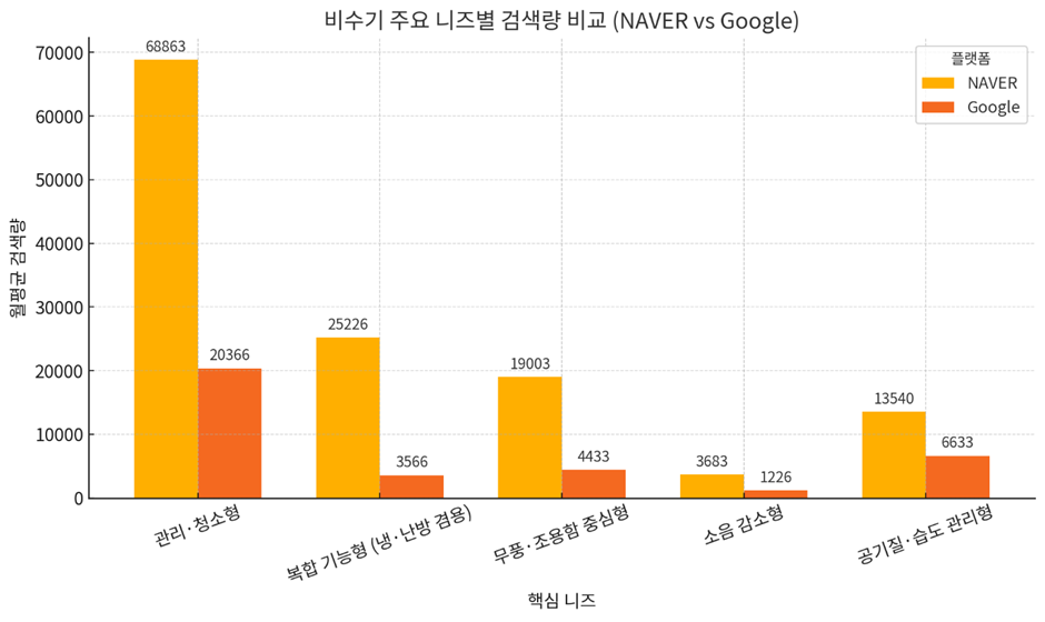 한눈에 보이듯, ‘에어컨 청소’와 ‘냉난방기’는 NAVER에서 특히 강세이며, ‘에어컨 제습’은 두 플랫폼 모두에서 균형 있는 검색량을 보이고 있습니다.