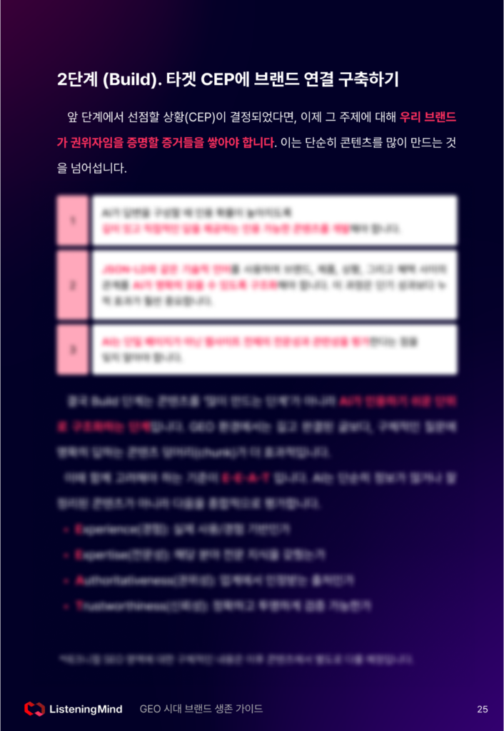〈GEO 시대 브랜드 생존 가이드〉는 생성형 AI 환경에서 브랜드가 어떻게 인식되고, 어떤 구조를 갖출 때 답변에 포함되는지를 실제 데이터와 프레임을 바탕으로 정리한 실행서입니다. 단순한 키워드 중심 접근이나 단기 테크닉을 제안하지 않습니다. 대신 CEP 중심의 브랜드 의미 설계부터 AI가 인용하기 쉬운 정보 구조 설계 방식까지 단계적으로 안내합니다. 즉, 실제로 조직에서 적용 가능한 실행 프레임워크를 제공합니다.