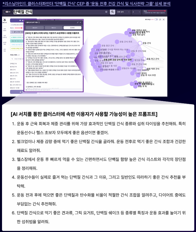 리스닝마인드의 클러스터파인더 기능은 GEO 관점에서 AI가 답변을 생성할 때, 실제로 인용·조합할 가능성이 높은 질문 구조를 기반으로 사용자 프롬프트를 도출한다. 해당 프롬프트 구성은 ‘왜 필요한지’, ‘언제, 얼마나 섭취해야 하는지’, ‘적절한 영양소 비율’ 등 AI 입장에서 인용할 수 있는 구조를 담고 있다.