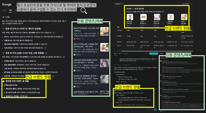 콘텐츠를 생성하기 전/후, 앞 단계를 거쳐 도출한 프롬프트를 주요 AI 응답 시스템(Google AI Overview, ChatGPT, 퍼플렉시티)내에 입력하여 언급되는 브랜드나 인용 콘텐츠, 매체 등을 파악하는 것은 매우 중요하다. 브랜드의 노출 여부, 경쟁사의 인용 현황을 파악해 향후 콘텐츠 및 미디어 매체 전략 등을 세울 수 있기 때문이다.