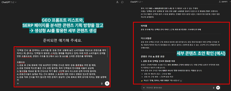 이와 같은 소스(구체적 CEP+ 콘텐츠 초안+ 검색데이터 기반 프롬프트)를 반영해, 생성형 AI를 활용하면 비교적 데이터 기반으로 구조화된 콘텐츠를 빠른 시간 내에 생성할 수 있다. 물론 초안인 점을 고려해, 브랜드 정보나 톤앤매너 등을 감안한 리라이팅 작업은 추가적으로 진행되어야 한다.
