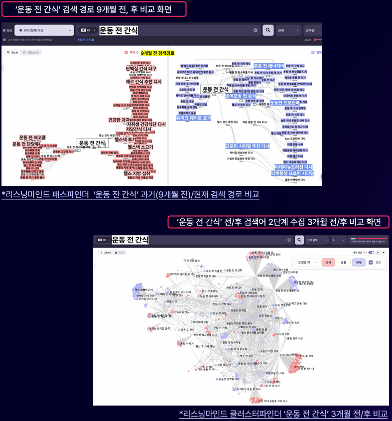 리스닝마인드의 ‘패스파인더’는 특정 키워드 전후로 검색된 흐름을 통해 소비자의 사고 경로와 관심 확장 방향을 보여줄 뿐 아니라, 경로 내 수집된 키워드를 같은 목적 및 의도별로 분류한 페르소나를 발굴할 수 있다. 예를 들어 ‘운동 간식 추천’ 이전/이후에 검색된 키워드를 분석하면 다이어트 관리, 건강 유지, 직장인 식단과 같은 맥락이 함께 나타난다. 해당 맥락을 기반으로 콘텐츠를 구성하면, 단일 키워드가 아닌 CEP 관점에서의 콘텐츠 제작이 가능하다.