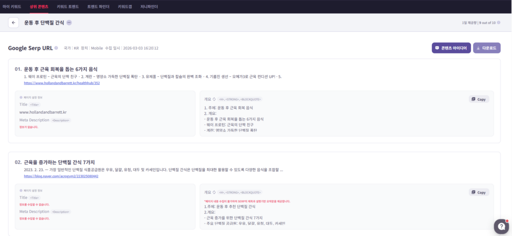 다음으로는 ‘타겟 키워드’와 관련해 빠르게 콘텐츠 초안(뼈대) 아이디어를 확인할 수 있는 방법이다. 리스닝마인드 실험실의 ‘상위 콘텐츠’ 기능은 아래 이미지와 같이, 구글에서의 타겟 키워드(운동 후 단백질 간식) 검색 결과 페이지의 상위 콘텐츠 분석을 기반으로, 콘텐츠 아이디어 초안을 제공한다.