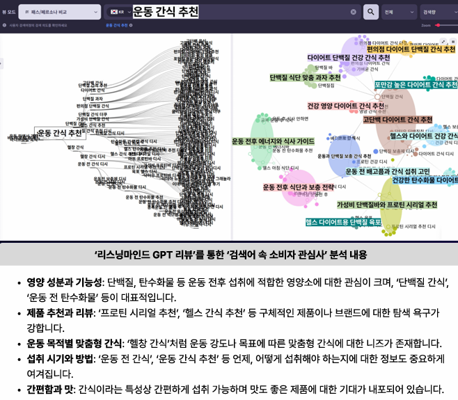 첫 번째로 리스닝마인드 패스파인더(검색 경로 분석) 기능을 활용해, ‘단백질 간식’ 카테고리에서 확인한 구체적인 CEP 키워드 중 하나인 ‘운동 간식 추천’ 연관 키워드로부터 소비자 구매 맥락을 한번 더 확인한다.