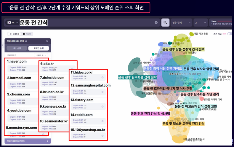 - 아래 이미지와 같이, 리스닝마인드 클러스터파인더 기능을 통해 ‘운동 전 간식’ 을 포함, 전/후에 검색된 키워드를 기준으로 영향력 있는 상위 도메인 순위를 확인할 수 있다. 해당 기능을 활용해, 검색엔진 및 AI가 신뢰하는 인용 경로를 데이터 기반으로 파악할 수 있다.