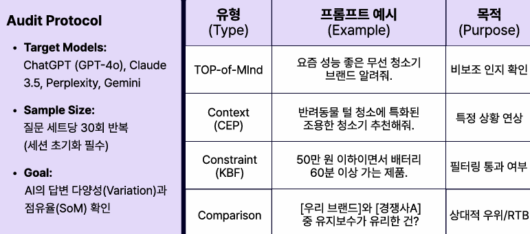 - 다음 표는 통계적 유의성을 확보하기 위해 질문 유형을 구분하고, 반복 테스트를 통해 브랜드 인식 패턴과 답변 구조를 진단하기 위한 Audit 시나리오 예시이다.