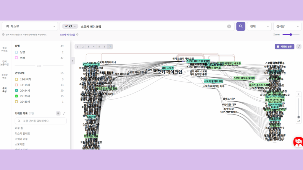 반면 20~24세, 25~29세는 ‘스모키 팔레트 추천’, ‘스모키 섀도우 팔레트’ 등 실제로 메이크업을 구현할 수 있는 팔레트 제품 탐색 키워드가 중심입니다. 이미 스모키 메이크업을 알고 있으며, 이를 위한 제품을 비교하고 구매하려는 인텐트입니다.