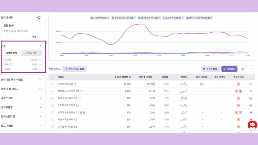 네, 소비자가 검색을 통해 탐색하는 모든 카테고리에 적용 가능합니다. 식품·패션·여행·금융·헬스케어 등 산업군과 무관하게, 핵심 키워드를 입력하면 해당 시장의 인텐트 구조를 파악할 수 있습니다. 특히 경쟁이 치열하거나 트렌드 변화가 빠른 카테고리일수록 검색 데이터의 유용성이 높습니다.