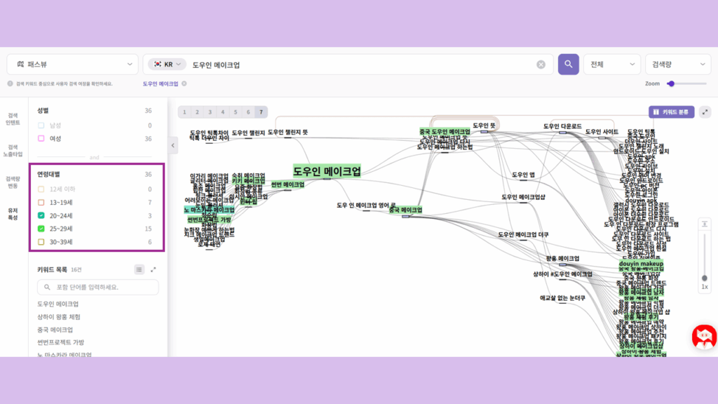 도우인 메이크업은 25~29세 여성이 주도하는 키워드입니다. 연관 검색어로 ‘노마스카라 메이크업’, ‘키키 메이크업’, ‘썬번 메이크업’ 등이 연결되는데, 이는 도우인을 통해 구체적인 화장법과 메이크업 트렌드를 탐색하는 인텐트임을 보여줍니다.