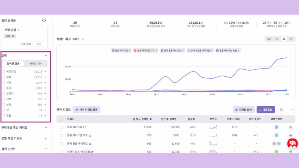왕홍 메이크업은 10~30대 특성 토픽 순위에는 없었지만, 도우인과의 비교를 위해 함께 살펴봤습니다. 최근 검색량이 빠르게 상승하고 있으나, 그 인텐트는 도우인과 본질적으로 다릅니다.