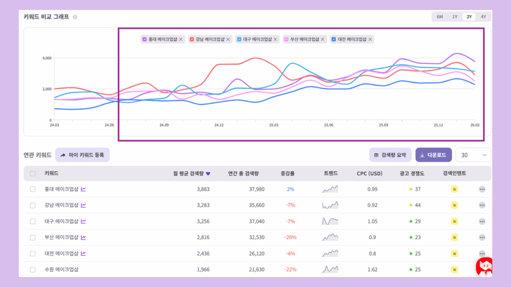 메이크업샵은 단독 검색보다 지역명과 결합해 검색되는 패턴을 보입니다. 월 평균 검색량 기준으로 홍대(3,883) > 강남(3,283) > 대구(3,256) > 부산(2,816) > 대전(2,436) > 수원(1,966) 순으로, 수도권은 물론 지방 대도시까지 고르게 수요가 분포합니다.