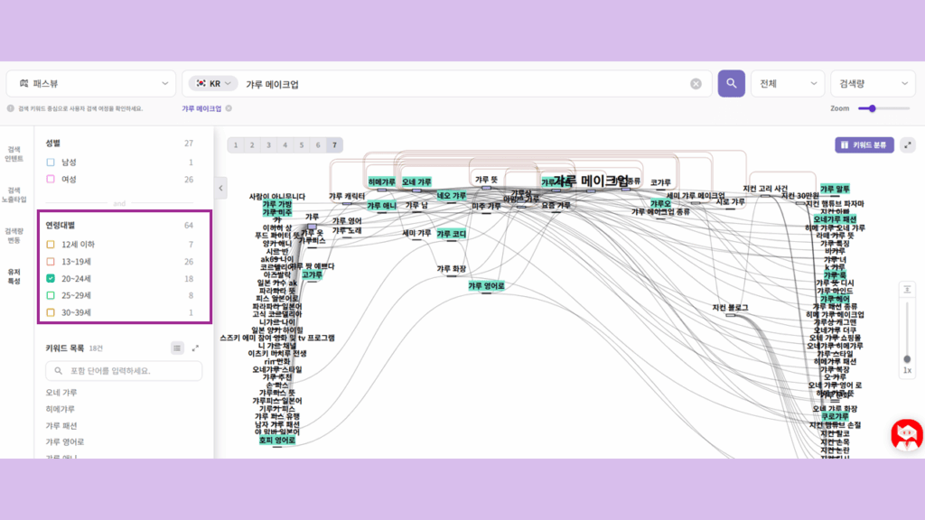 갸루 메이크업 검색 경로의 가장 큰 특징은 ‘메이크업’을 넘어선 서브컬처 전반에 대한 관심입니다. 검색 네트워크에는 가방, 패션, 코디, 애니메이션, 캐릭터 관련 키워드가 고르게 분포되어 있습니다. 화장법만 찾는 것이 아니라, 갸루라는 하나의 문화 전체를 탐색하는 행동 패턴입니다.