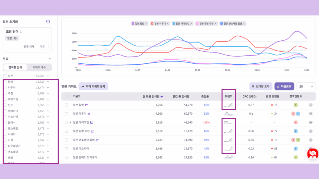 토픽 분류를 보면 립방, 파우더를 넘어 블러셔, 파운데이션, 캔메이크, 맨소래담, 니베아 등 다양한 제품 카테고리가 함께 검색되고 있습니다. ‘일본 메이크업’이라는 포괄적 관심보다, 특정 제품에 대한 구체적 탐색으로 검색 행동이 진화하고 있는 셈입니다.