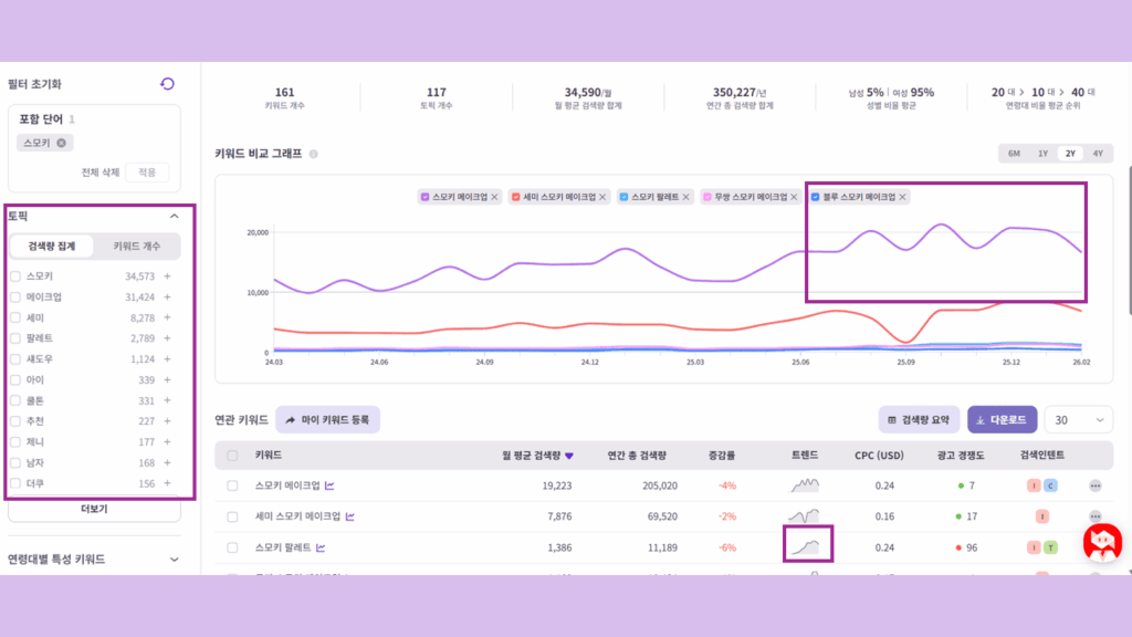 스모키 메이크업은 2025년 6월 이후 검색량이 점진적으로 회복되는 양상을 보입니다. 특히 ‘스모키 팔레트’ 검색량이 동반 상승 중이며, 연관 토픽에는 ‘아이섀도우’와 같은 제품 키워드가 함께 등장하고 있습니다.