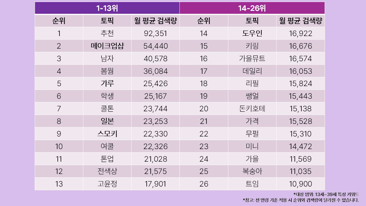 13~19세는 ‘메이크업 종류’ 등 스모키 메이크업이 무엇인지를 파악하는 정보성 검색 위주입니다. 아직 구매 단계로 이어지기보다는 개념을 익히는 단계에 있는 것으로 해석됩니다.