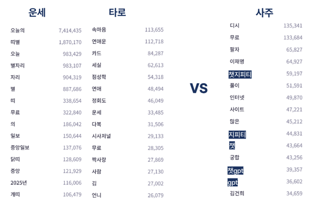 운세는 별자리 기반의 일상적 확인 행위로, 타로는 연애·심리 해석 중심으로 소비되는 반면, 사주 카테고리에서만 ‘챗GPT’ 관련 키워드가 유의미하게 등장한다는 점이 특징적이다.