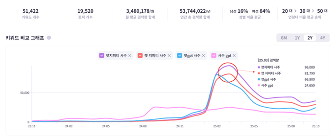 특히 2025년 3월 한 달간 ‘GPT+사주’ 관련 검색량은 약 26만 회 수준까지 증가하며, 하나의 트렌드로 자리 잡았음을 시사한다.