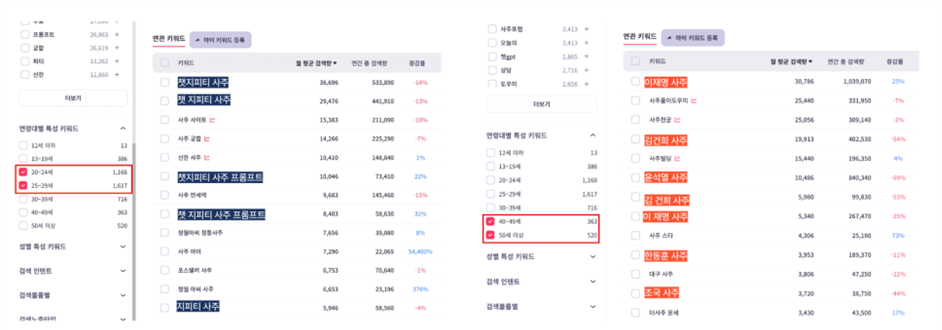 연령대별 ‘사주’ 연관 키워드를 살펴보면, 20대는 ‘챗지피티 사주’, ‘사주 프롬프트’, ‘GPT 사주’처럼 AI를 어떻게 활용할 것인가에 초점을 맞추고 있다.