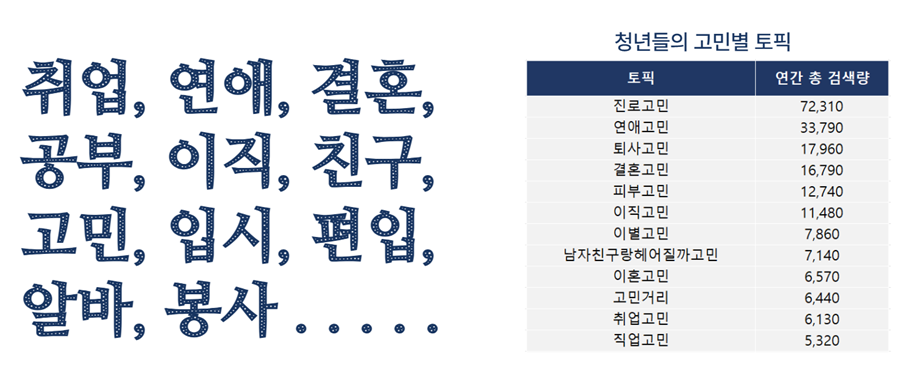 20대를 중심으로 불안·고민·걱정 관련 검색이 활발하게 나타나며, 진로·연애·이직·결혼 등 삶의 선택과 직결된 키워드가 상위에 집중된다.